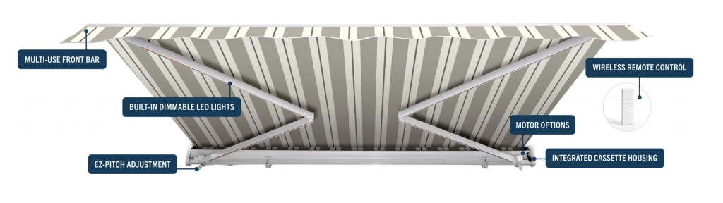 SunPro awnings are built with innovation and longevity in mind. Each awning comes standard with features most competitors offer only as add-ons—like dimmable lights, adjustable pitch, and wireless operation.